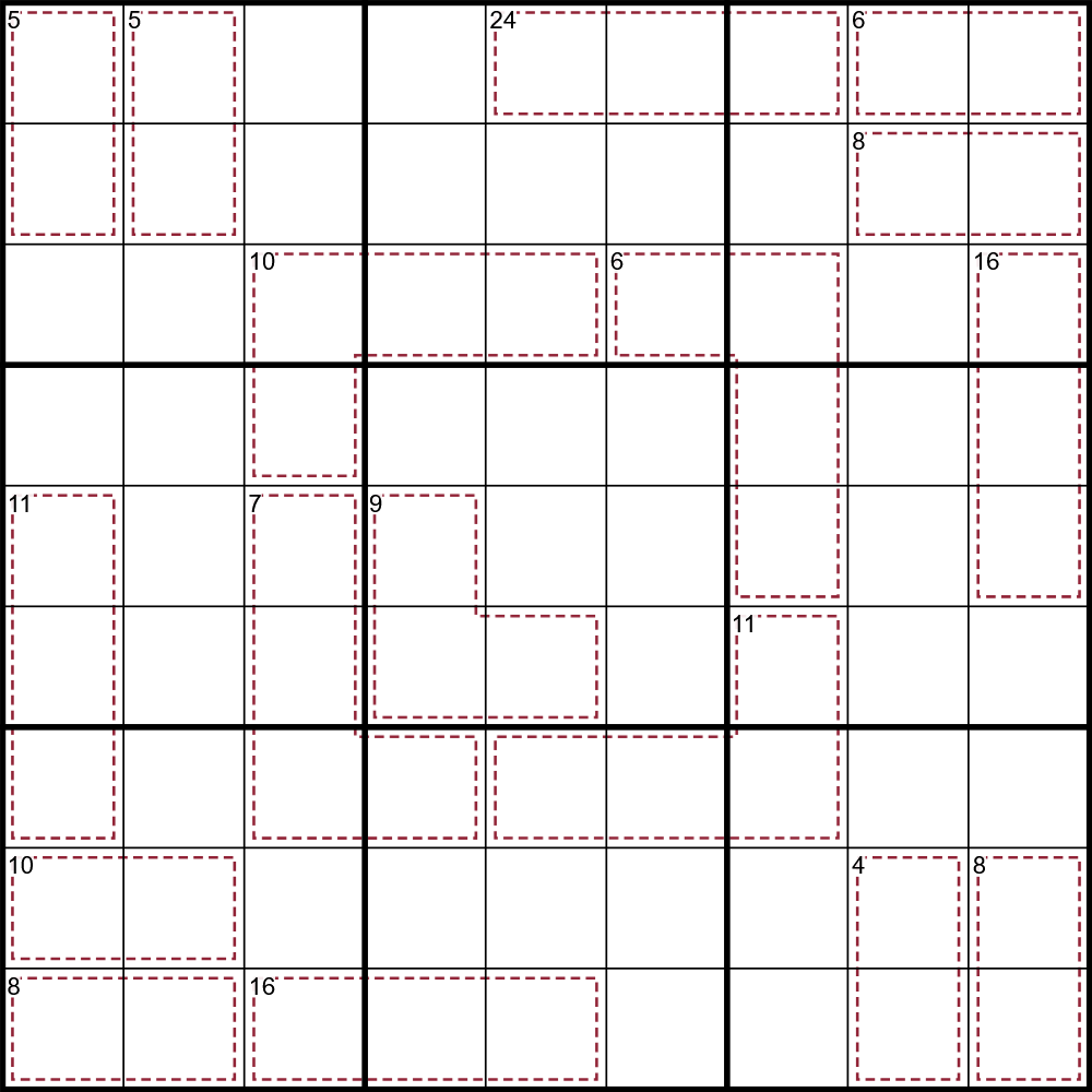 Digits may not repeat inside a cage and must sum to the indicated total.