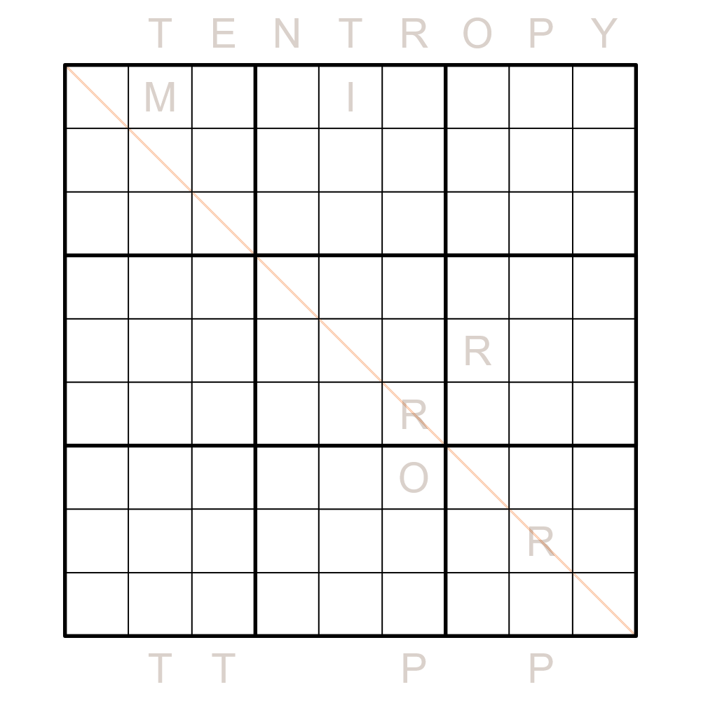 - Tentropy Mirror: Each cell has a digit in the same set of [19], [28], [37], [46], [5] as the cell reflected along the marked diagonal (e.g. if r2c6 is in the [28] class, r6c2 is also in the [28] class).