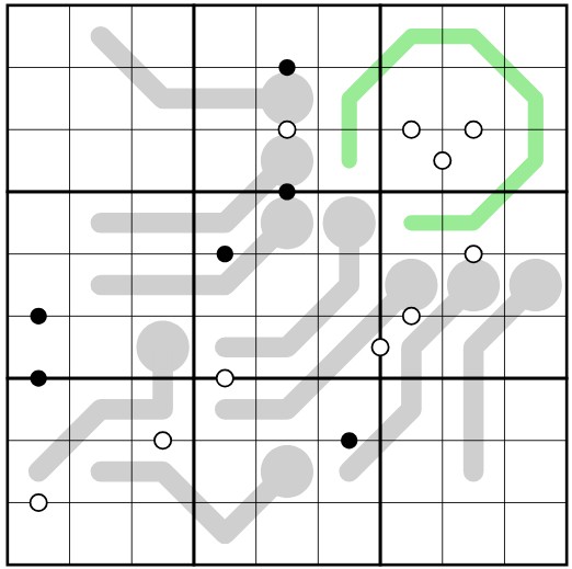 Kropki: cells separated by a white dot are consecutive. Cells separated by a black dot have a ratio of 1:2. Not all possible dots are given.