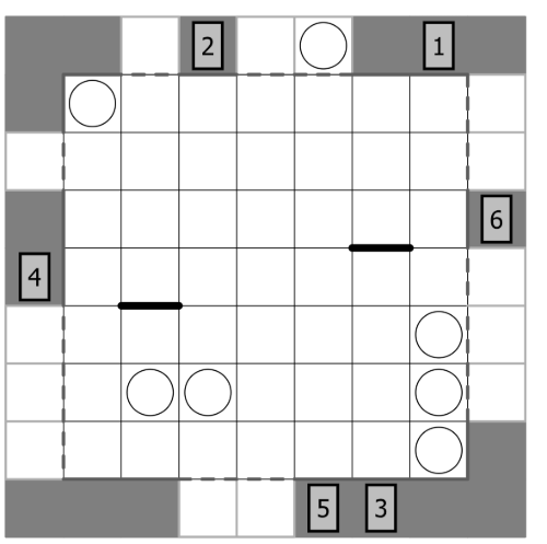• Blank outer clue cells are numbered rooms clues and must contain digits for solution check to work. Outside clues in rectangles are given numbered rooms clues. (A fully grey cell is to be left empty.) A clue's digit must also appear in the Nth position looking into the grid in the row/column, where N is the digit in the first position.