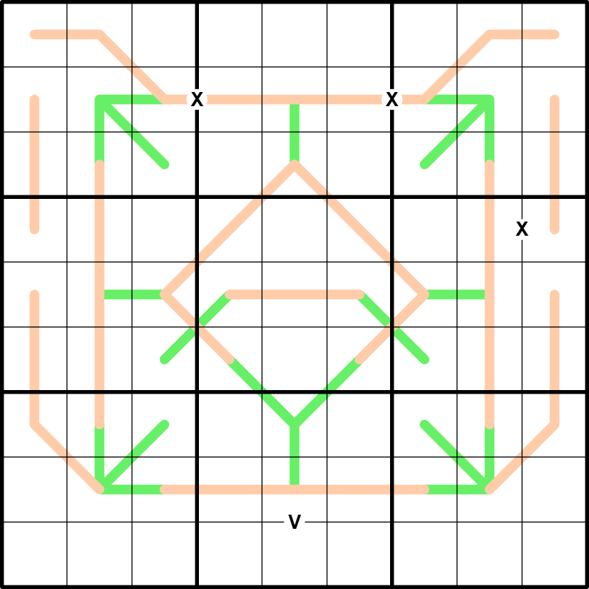 X/V: Digits in cells joined by an X sum to 10. Digits in cells joined by a V sum to 5. Not all Xs and Vs are given.