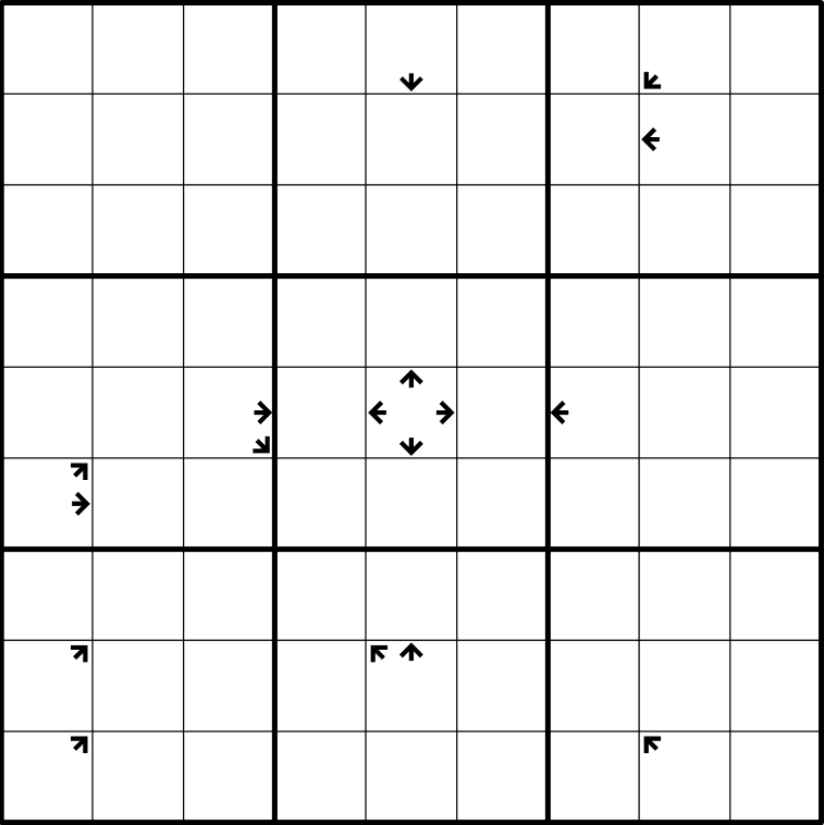 A digit in a cell with arrows equals the total sum of all digits in "friendly cells" in those directions.