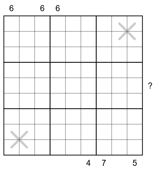 Numbered Rooms: Clues outside the grid indicate the digit which has to be placed in the Nth cell in the corresponding direction, where N is the digit placed in the first cell in that direction. A "?" can represent any number.