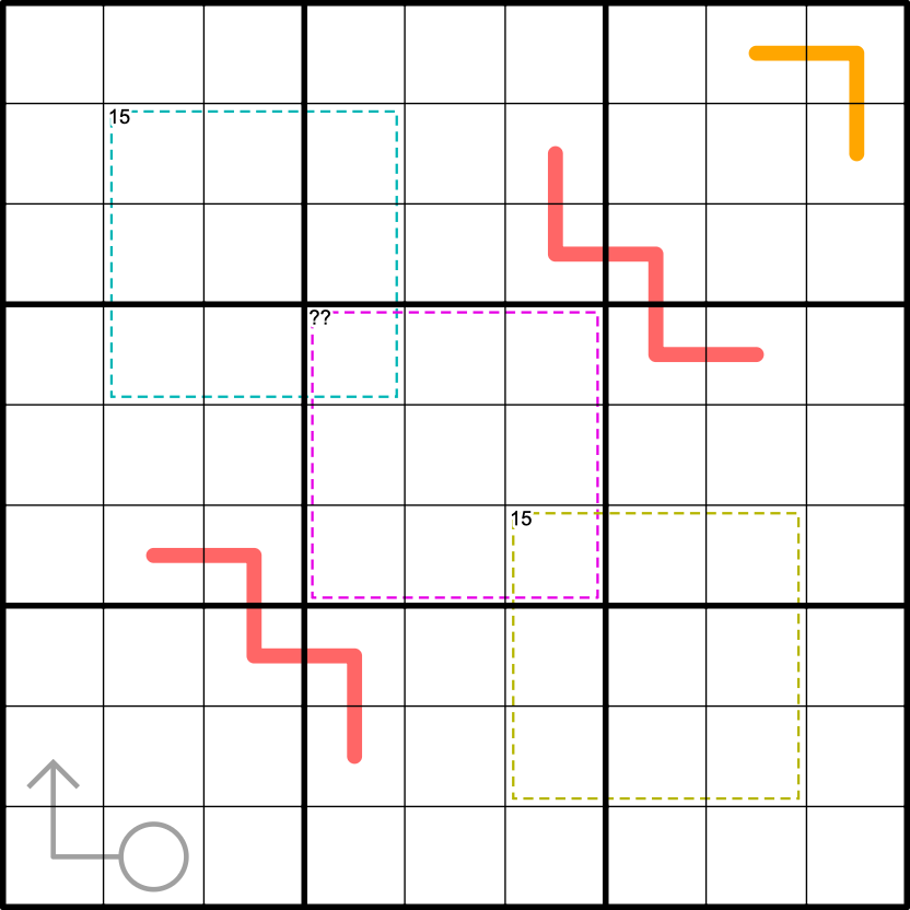 Magic Squares cages: Digits in each row, each column, and both main diagonals of a cage must sum to the same value in the top left corner. Digits may repeat inside Magic Square cage if allowed by other rules. The colours of the cages are for easier distinction and don't affect solution.