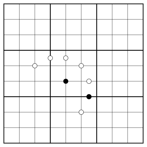 Cells separated by a white dot (orthogonally or diagonally) contain consecutive digits.