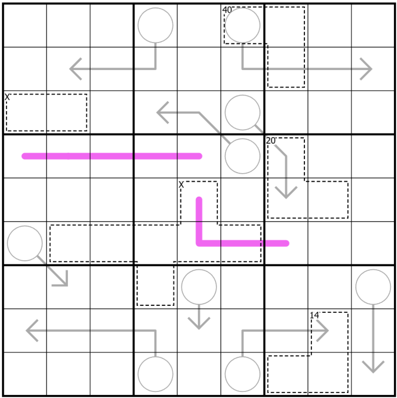 Normal sudoku rules apply. Color each cell either blue or green. All cells of the same color must be orthogonally connected, and no 2x2 area may be all one color. A green cell's value is equal to its digit doubled (a green 5 has a value of 10). Each of the constraint types listed below form a unique region consisting of the digits 1-9. The unique region for the arrows refers to the bulbs of the arrows. The 'X' cages form one region and numbered cages form a different region. Digits along a purple line form a non-repeating set of consecutive values in any order. Values in a cage sum to the indicated value in the top left corner of each cage. The value 'X' is determined by the solver. Sum of all values along an arrow sum to the value in that arrow's circle. ▶ Play online in SudokuPad