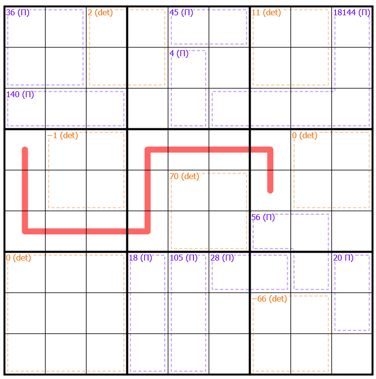 Digits in orange cages form matrices. The determinant of each matrix is given. Denoted with a (det)