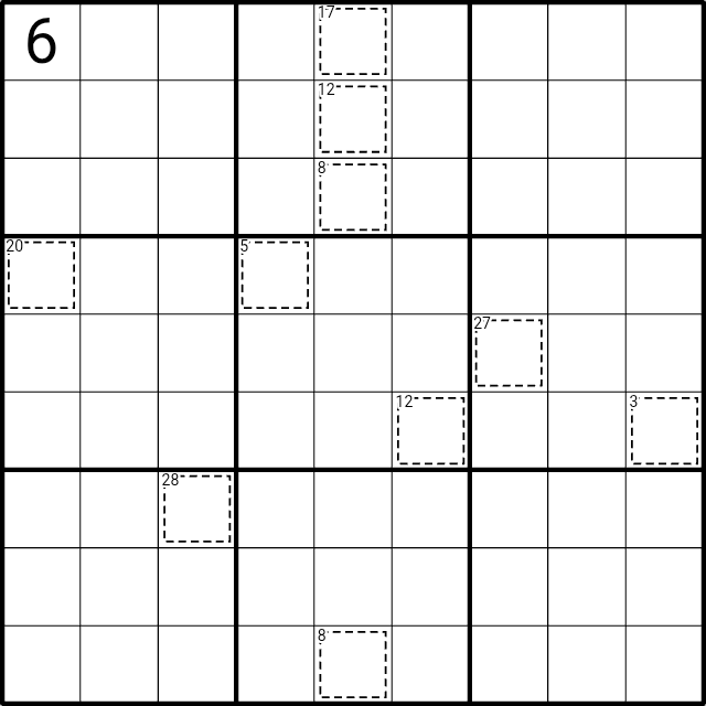 Each cell with a cage will form a domino with an orthogonally connected cell, the digits placed in these two cells will always add up to the same sum. No domino can contain more than one cage or share a cell with another domino.