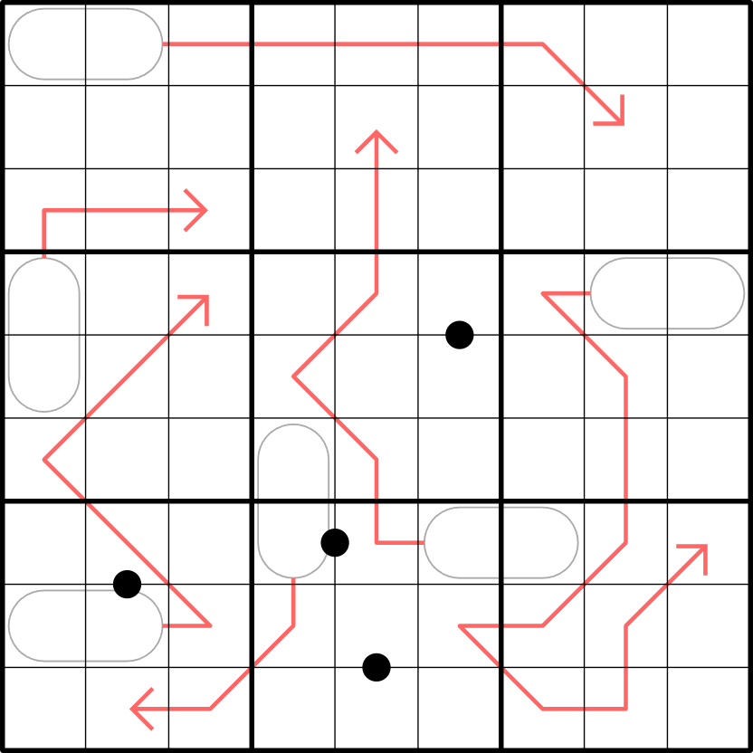 Kropki dots: Digits in cells joined by a black dot are in a 1:2 ratio (i.e., one digit will be double the other). Not all dots are necessarily given.