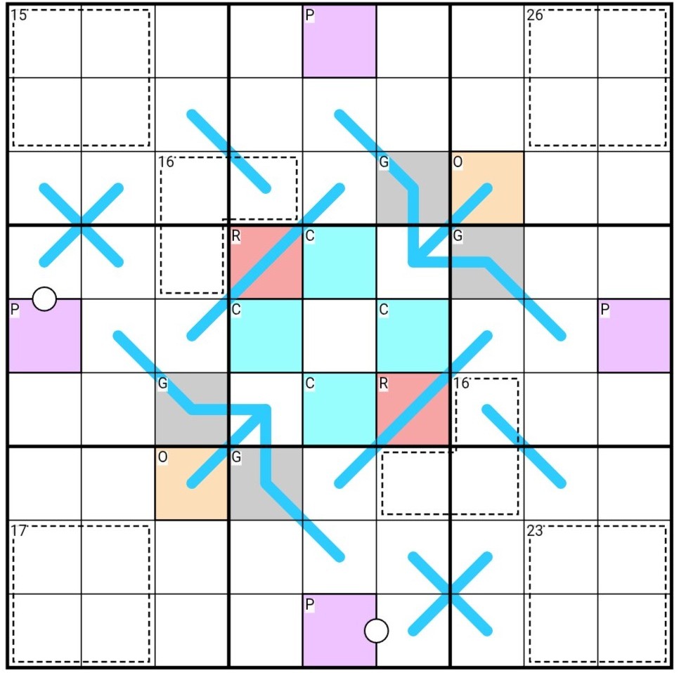 The grey cells (G) have identical pairs rotated 180° around the center digit. (r6c3 = r4c7, r7c4 = r3c6)