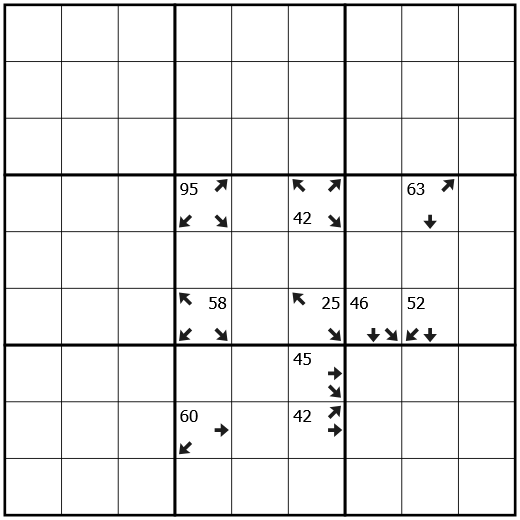 For each cell that contains arrows, shade all cells that can be reached by any combination of one-cell movements limited to the directions given by the arrows, starting from that cell; this includes all combinations that use one direction, multiple directions, and even no directions (the starting cell with arrows is included). The sum of the digits in all those shaded cells is given by the number in the cell with arrows.