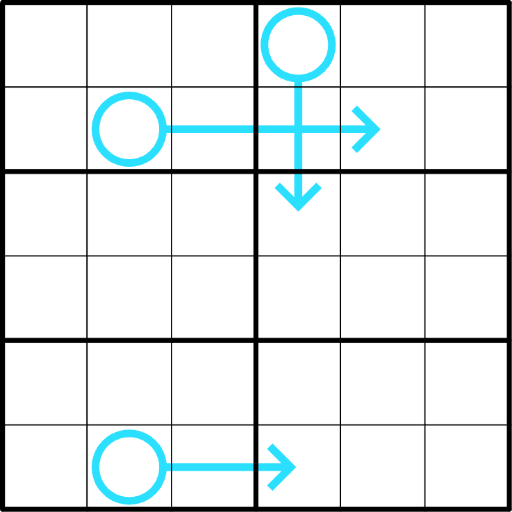 Arrows in this puzzle point either up, down, left or right, they never change direction, and all such arrows are given. That is, you could not draw any more of these straight arrows into the finished puzzle grid (even those that would overlap other arrows or their circles in any possible way).
