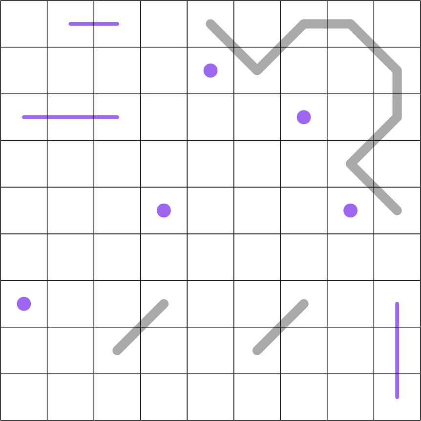 Laser Fire: Thin purple lines and dots obey the Seeing rule below; they have no other constraints.