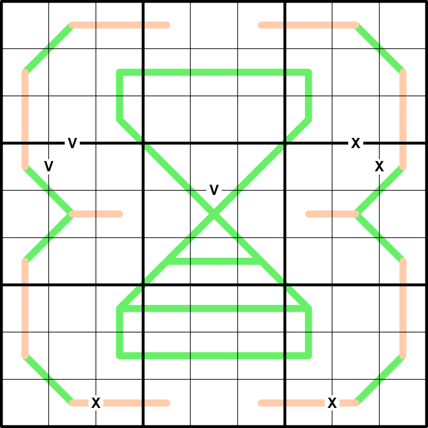 X/V: Digits in cells joined by an X sum to 10. Digits in cells joined by a V sum to 5. Not all Xs and Vs are given.