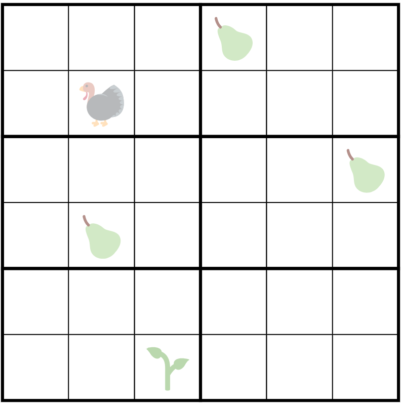 Partridge: The partridge (🦃) is not on the tree and its digit counts the number of non-tree cells in its 8 surrounding cells, not including itself.