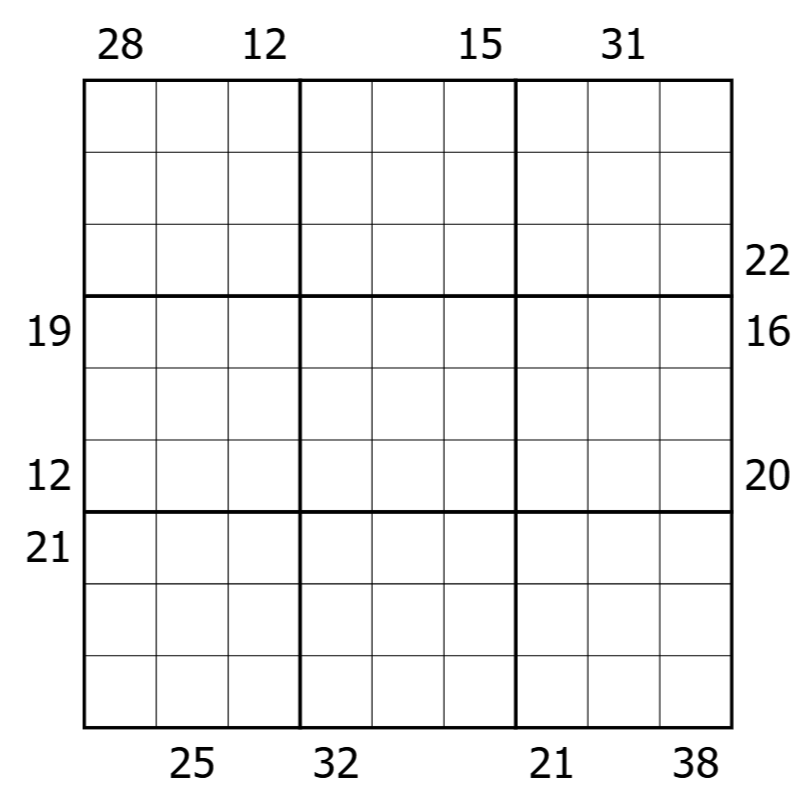 Each digit represents a skyscraper of the corresponding height. Clues outside the grid indicate the sum of the visible buildings from that direction, where higher buildings block the view of lower buildings.