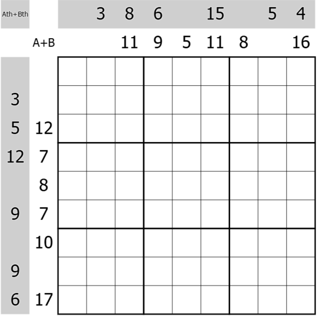 Digits in the first and second cell from the top and from the left are A and B. Clues outside the grid tell something about A and B: