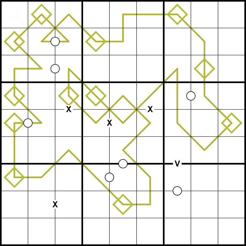There is a single gold line on the 9x9 Sudoku grid. Diamonds on the line, break the line into segments. Digits cannot repeat within a segment.