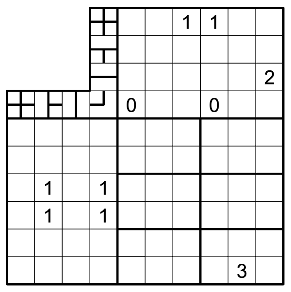 - U-Bahn: Draw a totally connected network through the centers of some cells in the grid. The network may branch or turn, but may not have any dead ends. Clues outside the grid indicate how many times the corresponding line shape (cross, branch, straight line, or turn) appears in that row/column, regardless of rotation.