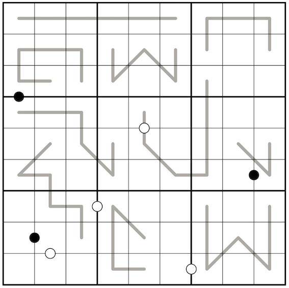 Yin-Yang colouring: colour each cell using two colours so that each colour forms a single orthogonally connected region and no 2×2 area contains only one colour.