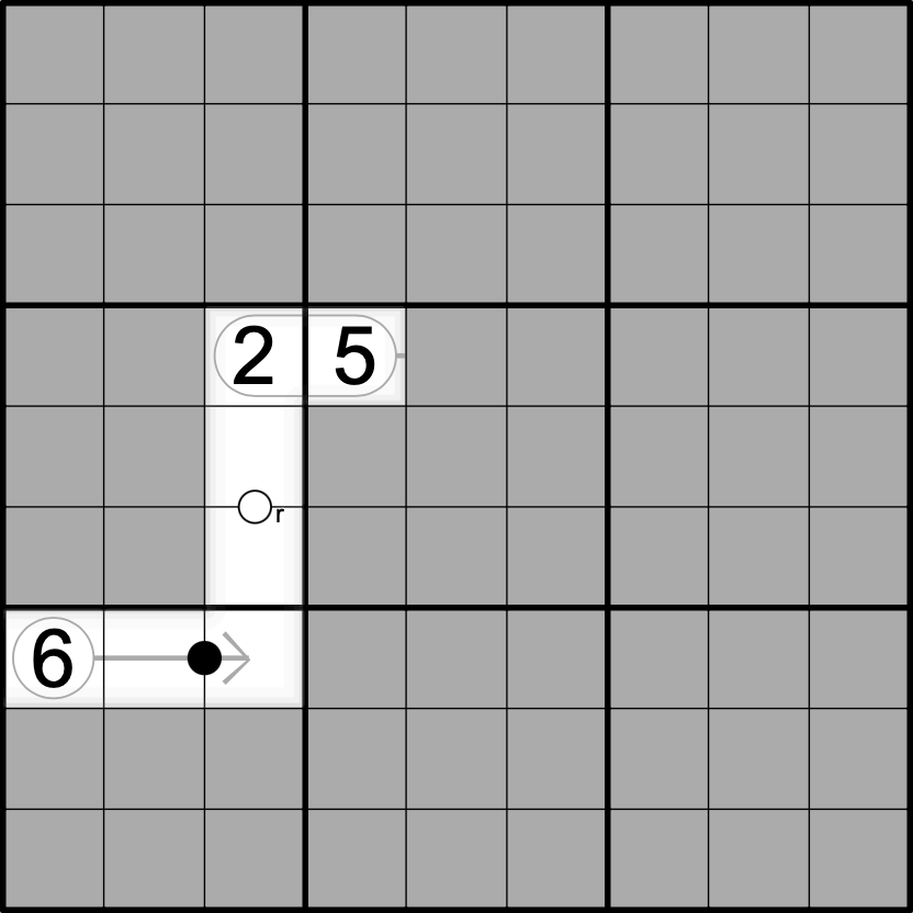 The digits 2, 5, 6 and 4 in each 3x3 grid box are all connected orthogonally and/or diagonally.