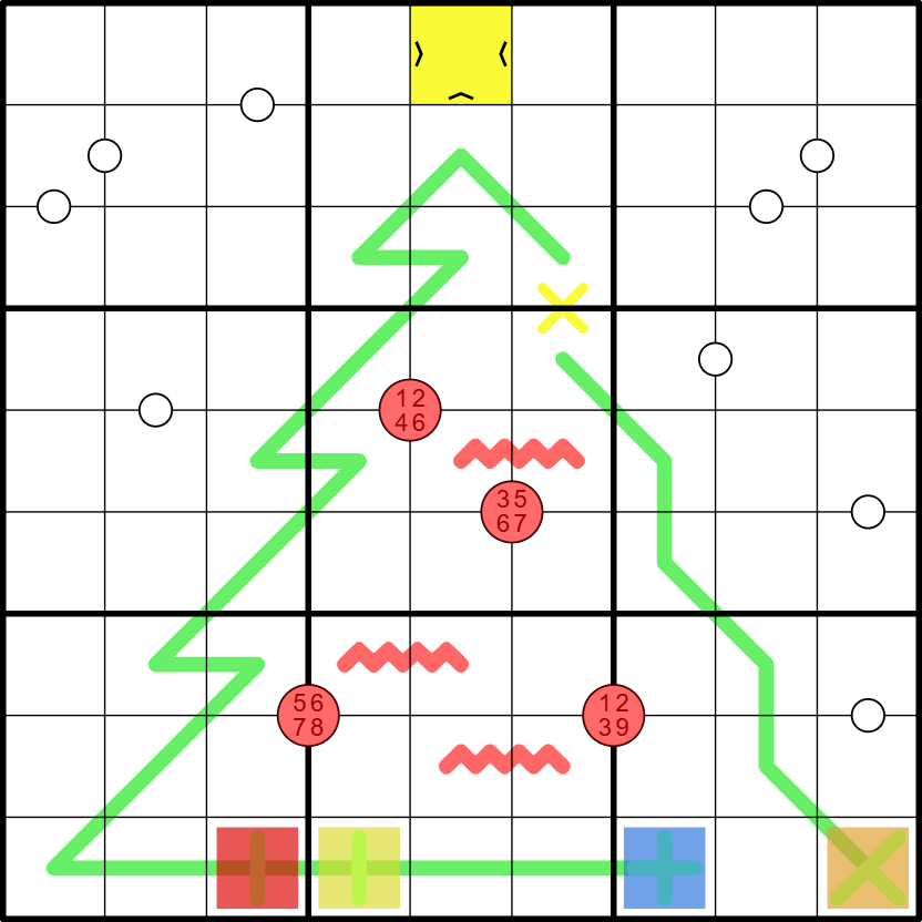 Nice puzzle, but very over-constrained. Solved ignoring the golden star and presents. Very aesthetic, though.