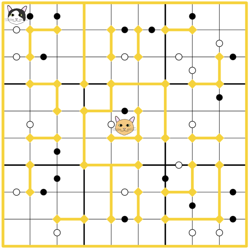 - Poppy the cat is playing hide-and-seek with his brother Leon. Leon has already run around the house and found a hiding place in the center of the house (r5c5). Poppy, starting from the northwest corner of the house (r1c1), must now copy that path and track Leon to his hiding place. Poppy's path must not visit any cell more than once, cross itself, or pass through any gold walls. As well as moving orthogonally, Poppy may move diagonally if there's a 2x2 space in which to do so, but may never pass diagonally through the sharp corner of a wall.
