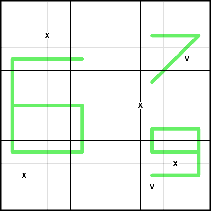 X/V: Digits in cells joined by an X sum to 10. Digits in cells joined by a V sum to 5. Not all Xs and Vs are given.