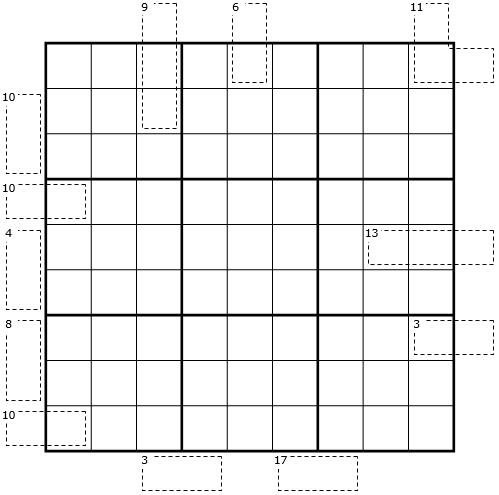 Each digit within the 9x9 region represents a skyscraper of that height. Digits outside this region indicate how many buildings can be seen from that direction, where higher buildings block the view of lower buildings. The small numbers in the upper left corner of a cage indicate the sum of the digits in that cage. Within a cage all digits must be different.