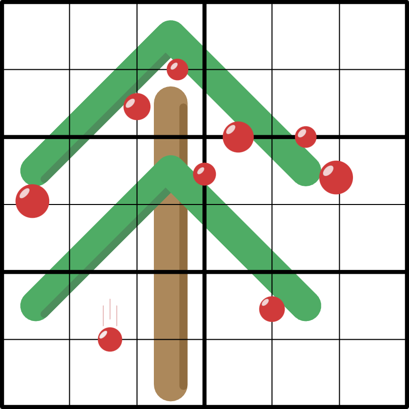 Trunk: The digits on the brown trunk form a form a set of consecutive numbers (e.g., 1-2-3-4-5), but they may appear in any order (e.g., 2-5-3-1-4).