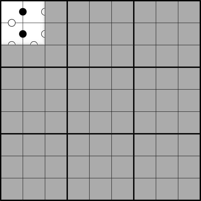 • Kropki Dots: Digits connected by a white dot must be consecutive. Digits connected by a black dot must be in a 1:2 ratio. Not all possible dots are necessarily given.