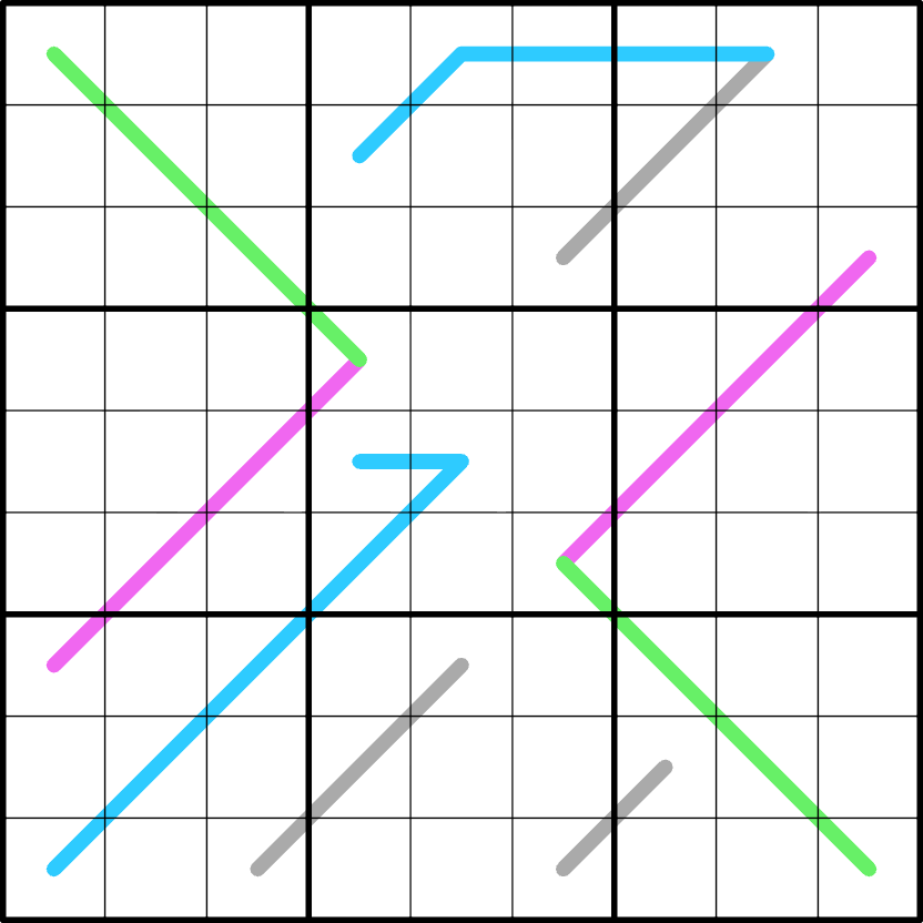 Tenban Lines - Digits along a pink line form a continuous, non-repeating set in any order.