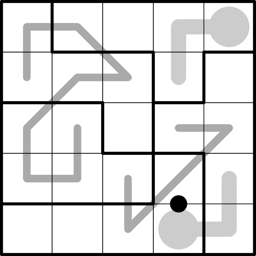 - Place the digits 1-5 exactly once into every row, column and region (limited by thick black lines).
