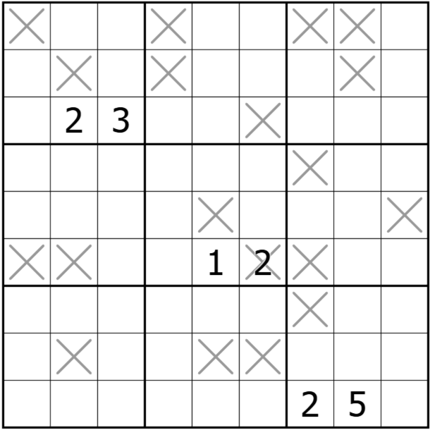 Cells with crosses can contain a maximum digit of 4 in case they are in a corner or 6 in case they are elsewhere along edges.