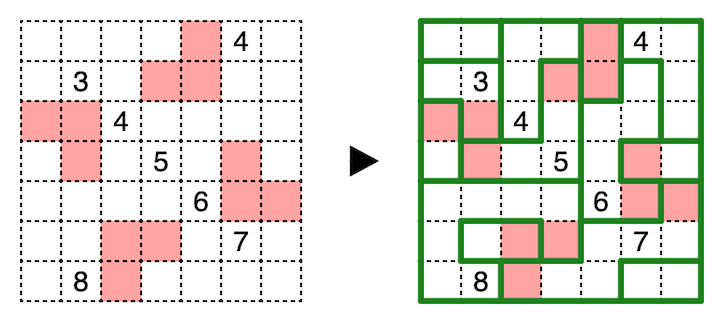 Divide the grid along the boundary lines so that every cell belongs to a snake. A snake is a one-cell-wide path at least two cells long that does not touch itself, not even diagonally. Colored cells must be at one of the ends of a snake. Two snakes of the same length may not touch orthogonally.