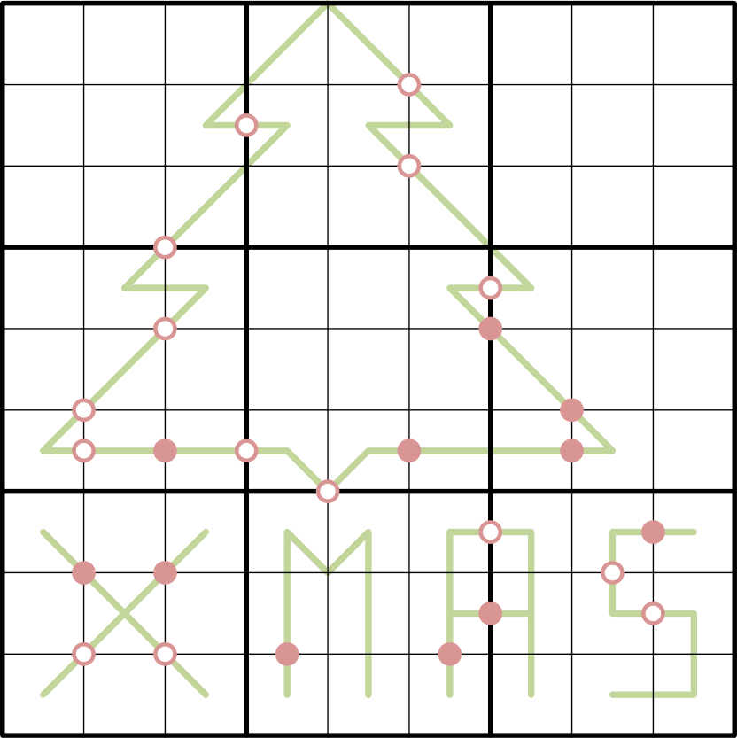 This sudoku advent calendar contains 24 variants that were included in my Sudoku Variants Series (SVS) but turned out to be too hard to be solved by a wide range of puzzlers. I aim for difficulties of 1-2 stars and have written some general and/or specific hints as well. I hope some players will try the original SVS puzzle #282 after solving the advent version.