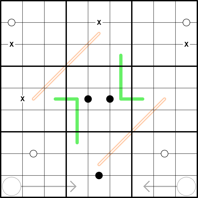 White kropki dots: Digits in cells joined by a white dot are consecutive. Not all dots are given.