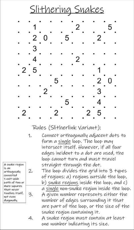 2. The loop divides the grid into 3 types of regions: a) regions outside the loop, b) snake regions inside the loop, and c) a single non-snake region inside the loop. A snake region is an orthogonally connected 1-unit-wide path of two or more squares that never touches itself, not even diagonally.