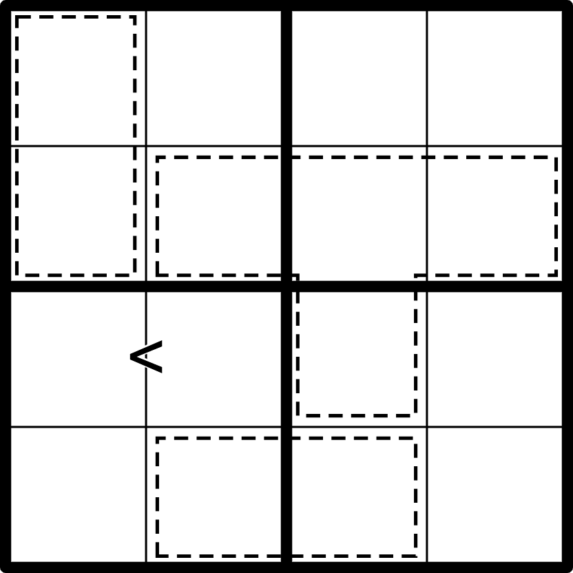 - Fill the grid with 4 different digits selected from 0-9 such that no digit repeats in a row, column or marked 2×2 box.