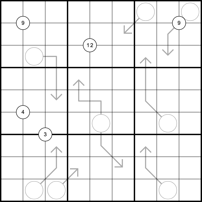 Arrows: Digits along an arrow sum to the number in the attached circle.