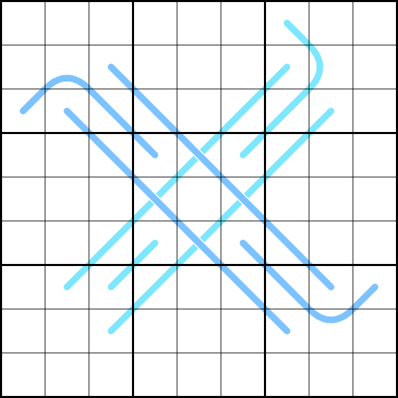 Region sum lines: The 3x3 box borders divide each of the 8 blue lines into segments with the same sum (this sum may be different for different lines).