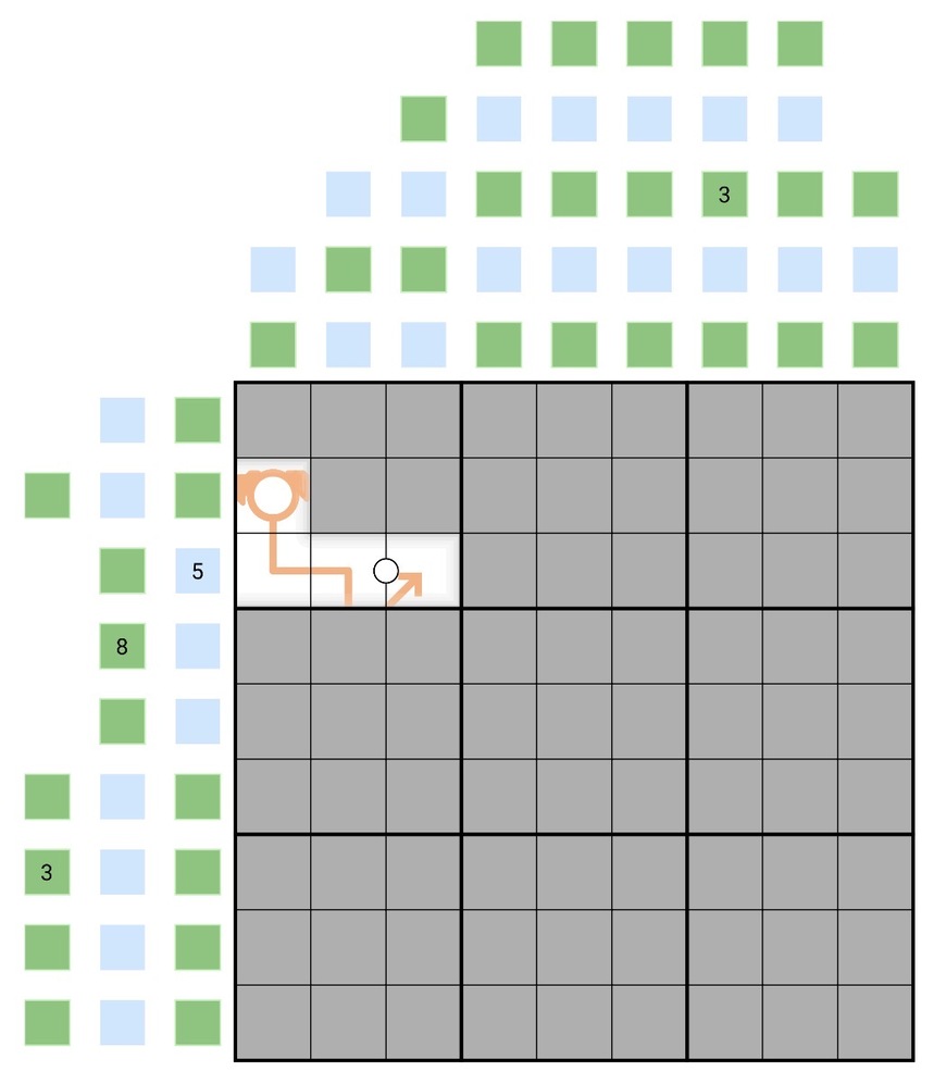 All clues are given and in order. In the final grid all cells are either blue or green.