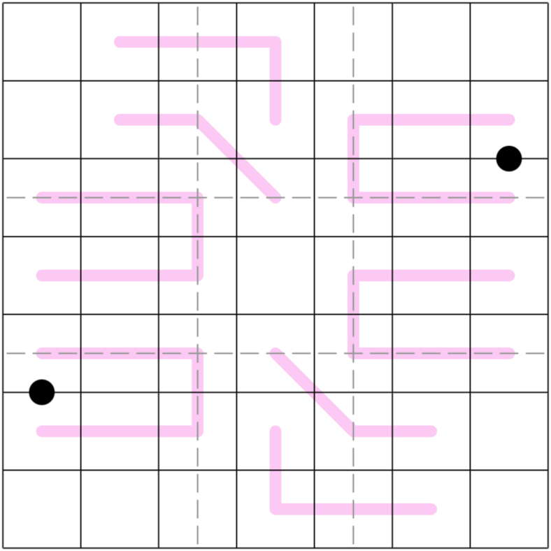 - Squishdoku: Place the digits 1 through 9 once each in every 3x3 box, without repeats in any row or column. Cells on region borders (dashed lines) are shared between multiple boxes.