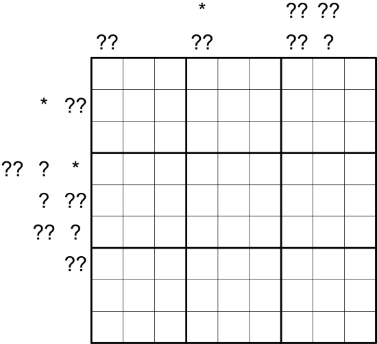 Japanese Sums: Clues outside the grid give the sums of shaded cell segments in the respective row or column, in order, where unshaded cells separate segments. A question mark indicates any digit from 0 to 9, but no clue may have a leading zero. An asterisk denotes an arbitrary number of Japanese sum clues. This could be zero, one, or multiple.