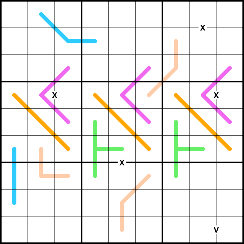 - V-Sums: Digits separated by a V sum to 5. (X and V sums are considered separate constraint types for Uniqueness)