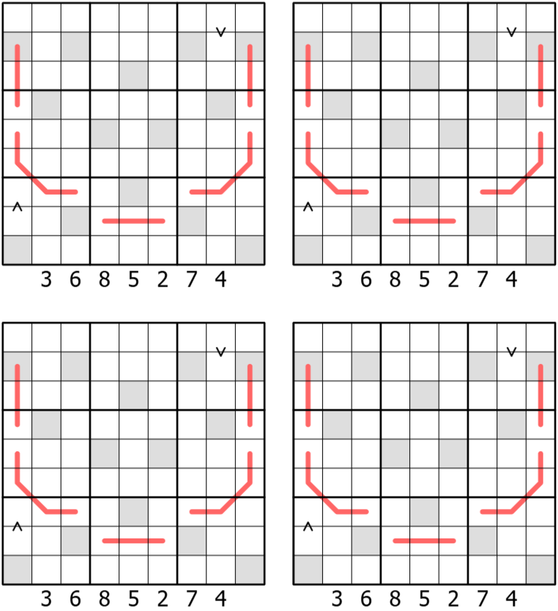 This puzzle consists of four puzzles sharing the same grid layout. They appear visually identical; however, the outside clues have different meanings in each puzzle. The rules for these four puzzles are as follows: