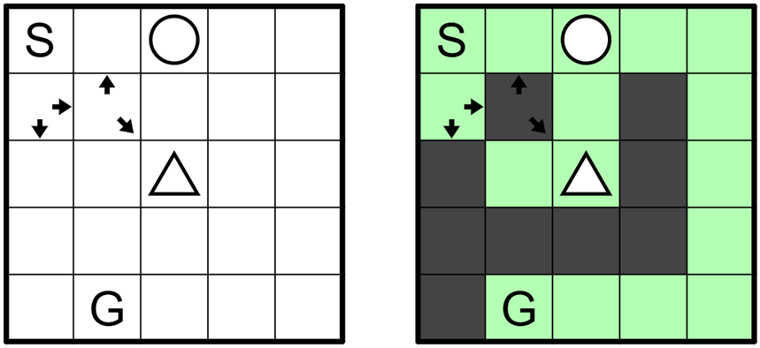 • There is exactly one orthogonal path of unshaded cells from S to G that passes through every circle, and doesn't backtrack. Triangles are unshaded but not on the path.
