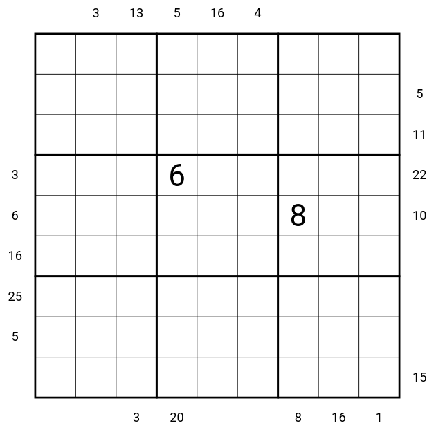 Numbers outside the grid indicate the sum of all uninterrupted odd numbers in that row or column, starting from the respective side. For example, if row three were 174652893, then it would say 8 to its left and 12 to its right.