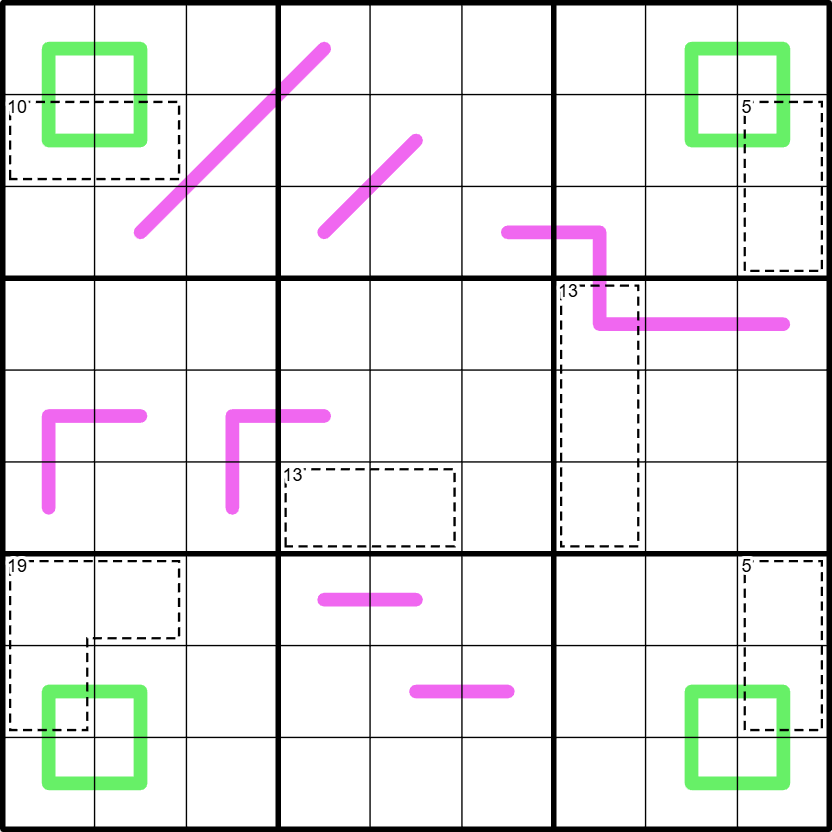Renban: Digits along a magenta line form a set of consecutive non-repeating digits in any order.