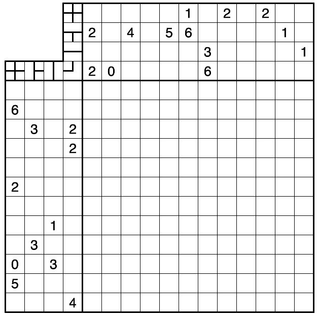 - Aqre: Shade some cells so that all shaded cells form one orthogonally connected area. There may not exist a run of more than three consecutive shaded or unshaded cells horizontally or vertically anywhere in the grid.